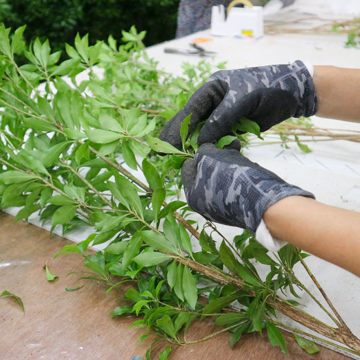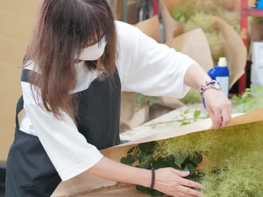 枝ものをより良い状態でお届けするため、枝や葉の下処理や足元の切り戻し、水揚げをしてから梱包しています。